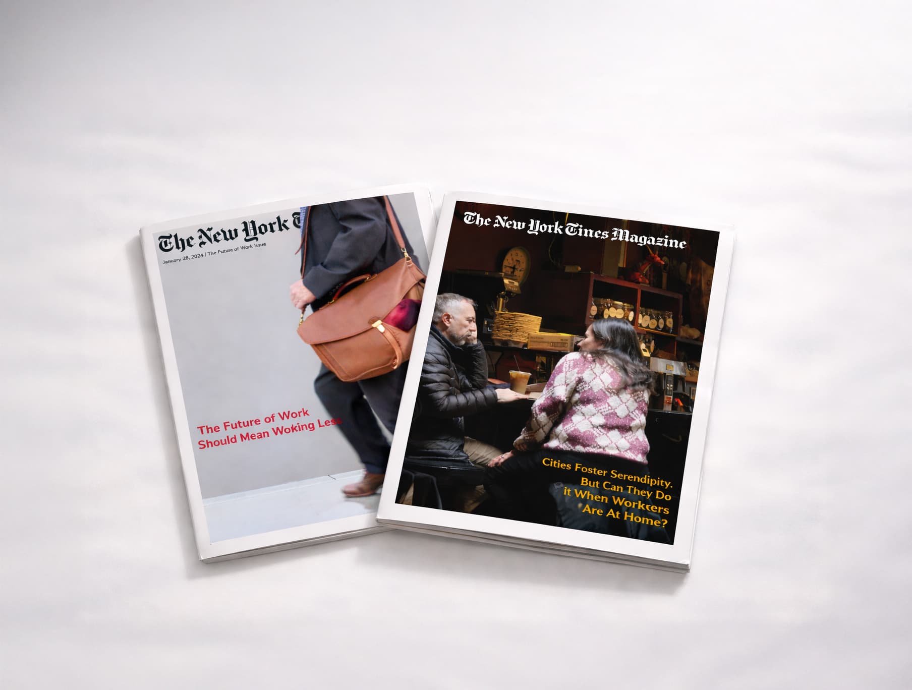 Design two magazine covers for The New York Times Magazine based on articles exploring the future of work and the ripple effects of remote work. This was my first real design project, where I learned the fundamentals that feel obvious now but weren't then: how to take a clean photograph, how to actually lay type over an image without it falling apart, how composition creates hierarchy before you even touch the typography. It was about understanding how text and image negotiate space on a page.